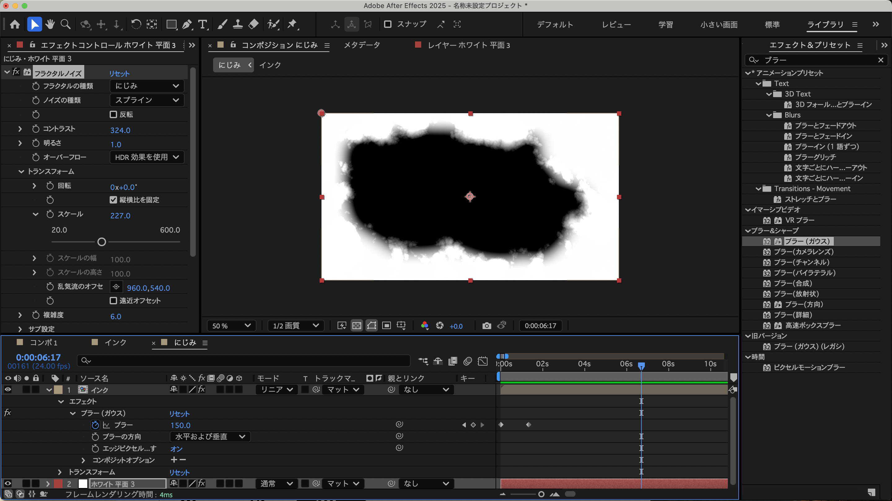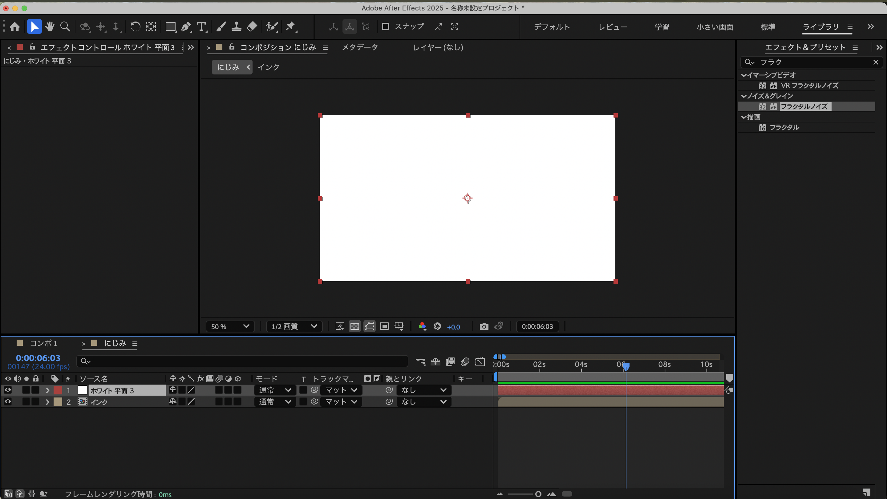 それが終わったら、インク滲みの端っこのモニョモニョを表現するために新しく平面レイヤーを追加して「フラクタルノイズ」というエフェクトをかけます。