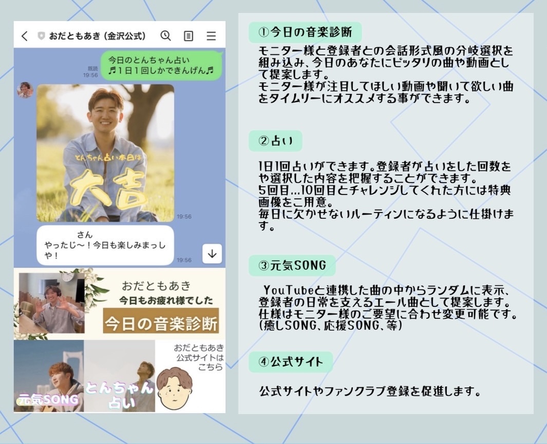 - 1日1回の占いが可能です。登録者が占いをした回数や内容を把握することが可能です。特典画像を用意することもできます。登録者の日々に欠かせないルーティーンとなるように仕掛けます。